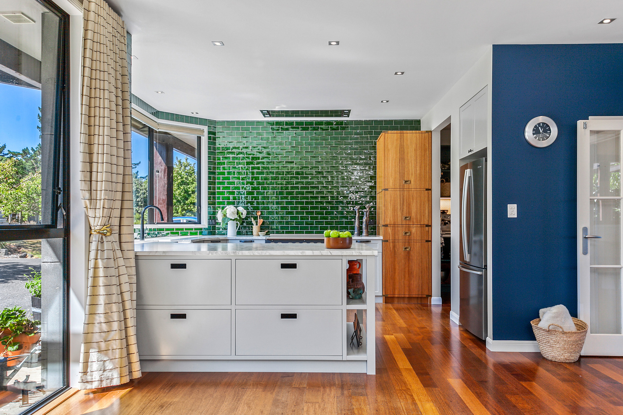 Clean white cabinetry with funky wrought iron handles and butler sink compliment the loud green feature tiles perfectly.